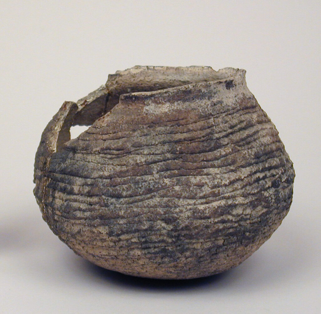 This piece is an excellent example of colombin (or coiled) pottery. This technique has been used in ceramic production since prehistory. The technique consists of superimposing long strands of clay, called colombins, obtained by rolling a piece of clay with the palm of the hands. The piece is solidified by pressing the colombins together, then smoothing the surface as the piece rises. Unfortunately, we have almost no information on the provenance of this piece collected by Father Carrier, other than the fact that it is of Indigenous origin.