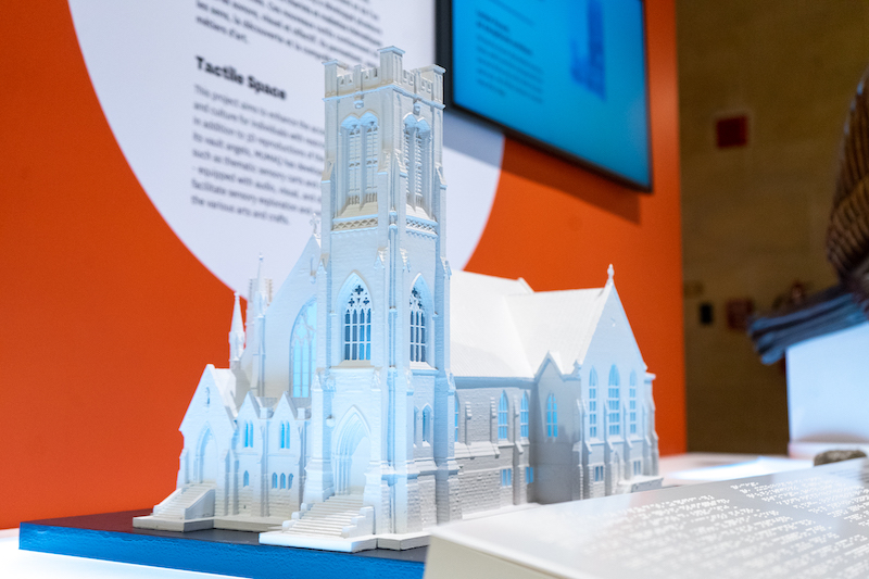 Ce projet comprend plusieurs volets. Une maquette sensorielle a été créée pour permettre aux visiteurs de se familiariser avec la disposition spatiale du musée avant leur visite et nous y avons ajouté un détail architectural significatif, à savoir un ange.