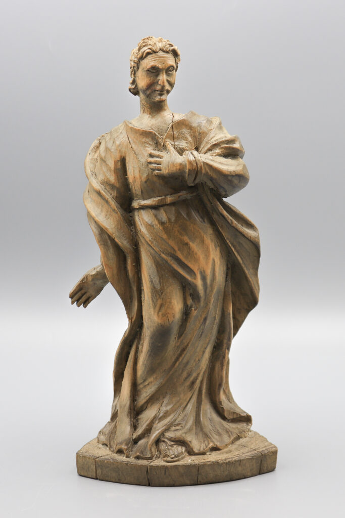 Ce personnage faisait partie d’un ensemble de quatre évangélistes réalisés pour l’église de Saint-Antoine de Longueuil. Un style Louis XV, que certains spécialistes associent à la maîtrise des Écores.